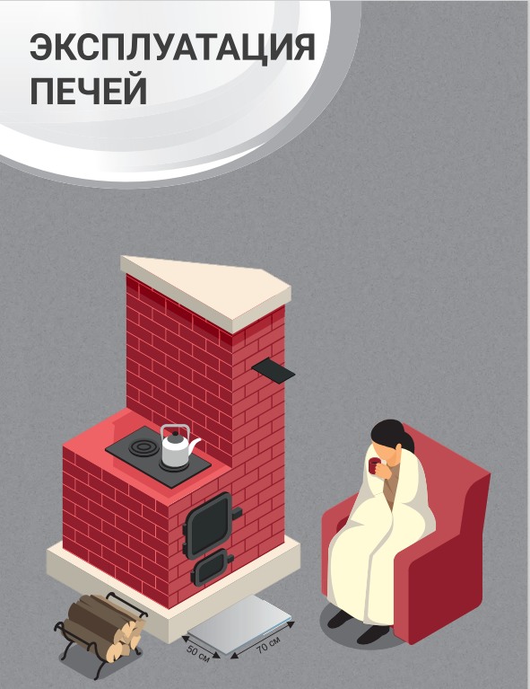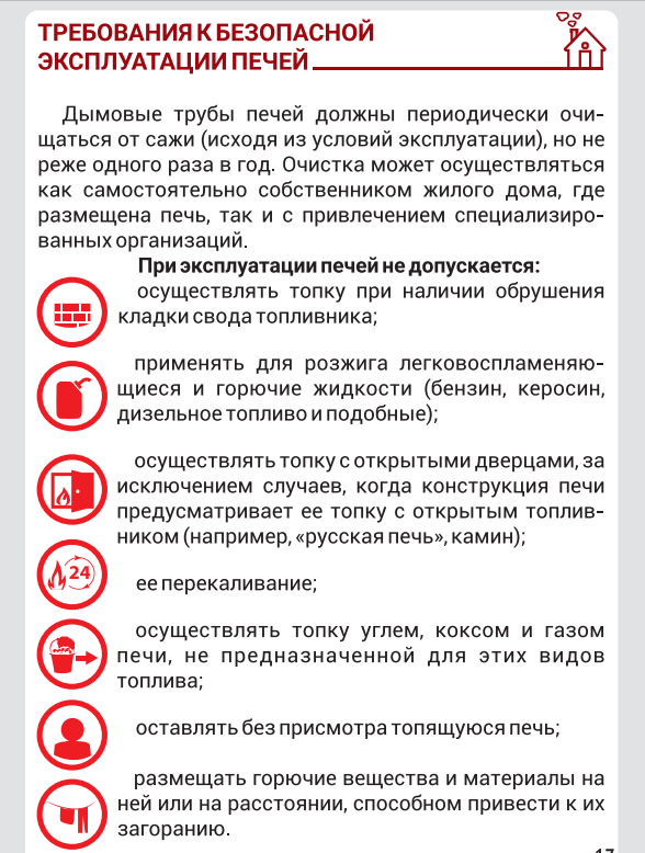 Не допускается эксплуатация печей с трещинами, прогарами и нарушенной кладкой. Запрещено использовать для растопки легковоспламеняющиеся жидкости, оставлять топящиеся печи без присмотра, а также перекаливать их. Зола и угли должны выноситься только в металлических ёмкостях.