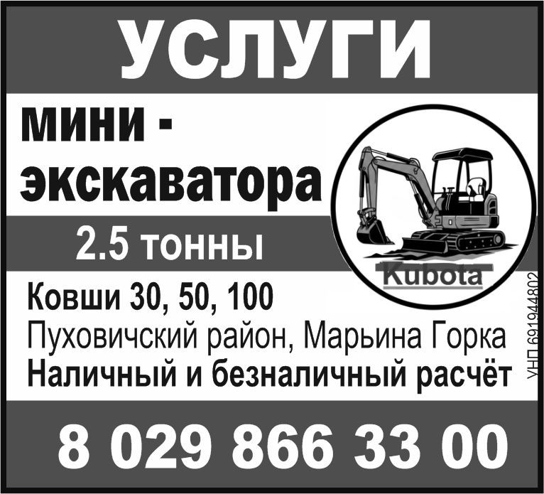 Аренда мини-экскаватора 2.5 тонны в Марьиной Горке и Пуховичском районе.