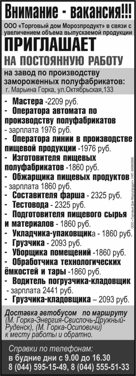 МАРЬИНА ГОРКА – В связи с увеличением объемов производства и в рамках программы повышения благосостояния сотрудников, ООО «Торговый дом Морозпродукт» объявляет о существенном повышении заработных плат на заводе по производству замороженных полуфабрикатов.