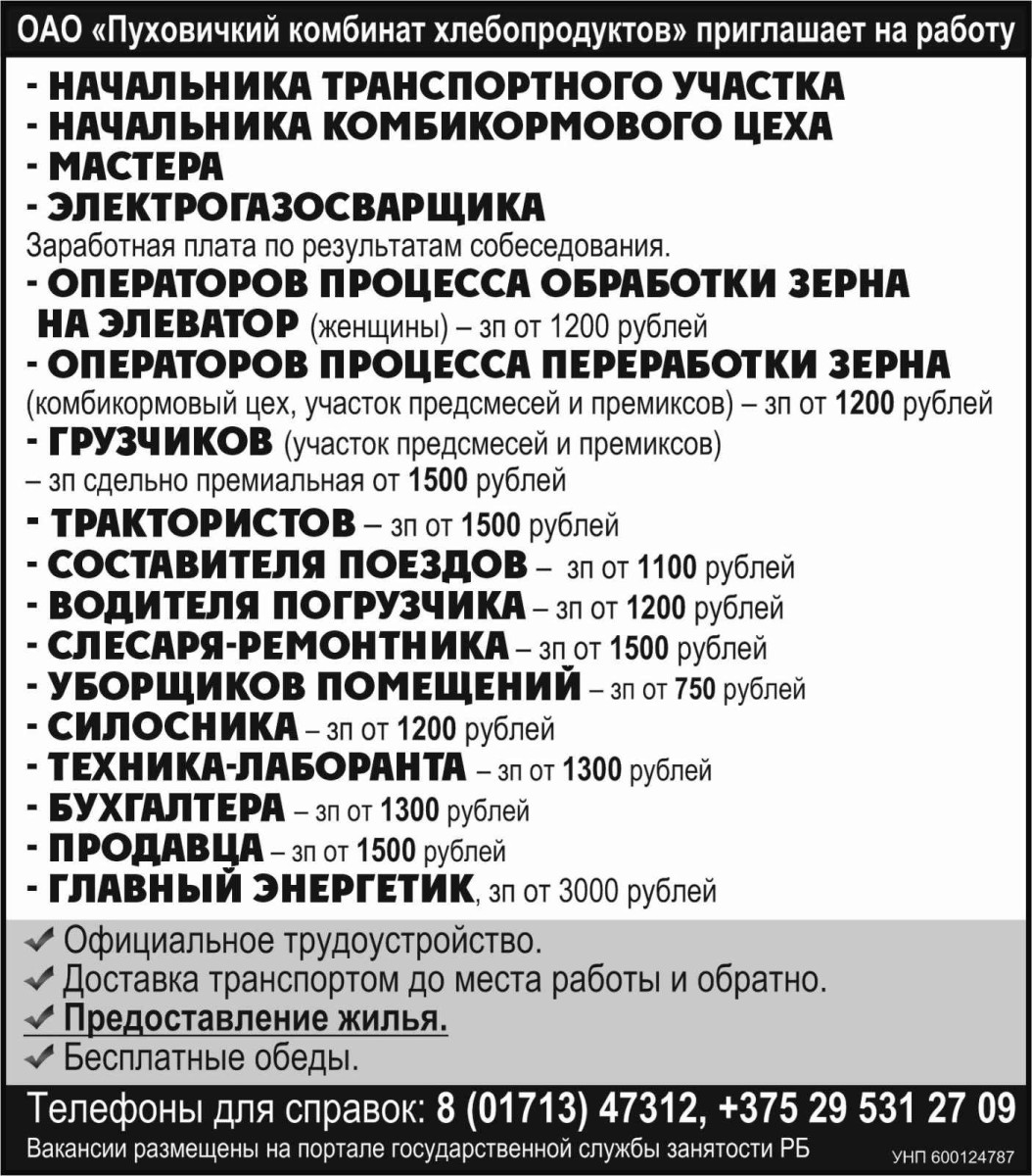 ОАО «Пуховичкий комбинат хлебопродуктов» приглашает на работу