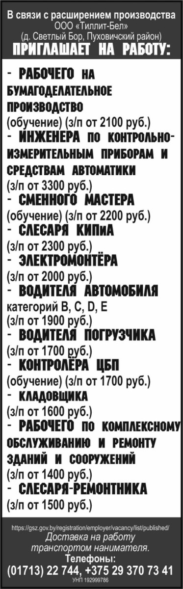 В связи с расширением производства ООО «Тиллит-Бел» (д. Светлый Бор, Пуховичский район) приглашает на работу:
